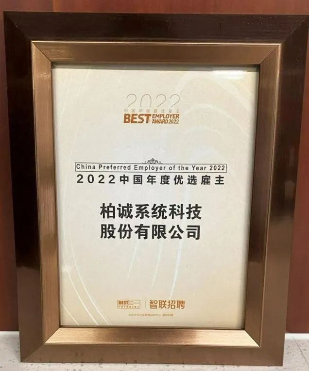 近日,柏誠系統(tǒng)科技股份有限公司榮獲智聯(lián)招聘“2022中國年度優(yōu)選雇主”稱號。
