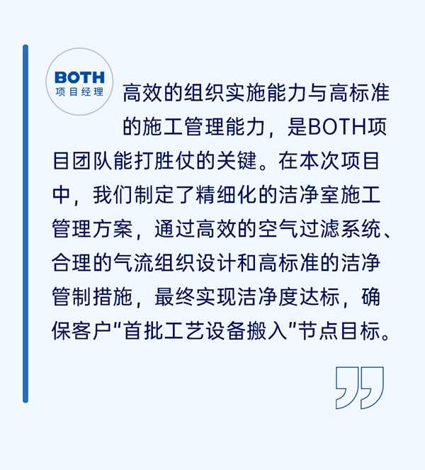 顯示面板對生產(chǎn)環(huán)境有嚴(yán)格的參數(shù)要求,潔凈標(biāo)準(zhǔn)較高。憑借在新型顯示領(lǐng)域20多年以來的成功經(jīng)驗,在本次項目中,BOTH發(fā)揮專業(yè)優(yōu)勢,完美踐約履諾,按照“快速啟動、高效施工、快速清退、高標(biāo)準(zhǔn)移交”要求,從前期策劃、項目施工,再到調(diào)試測試,僅用80余天就實現(xiàn)項目等各項潔凈指標(biāo)達標(biāo),推動客戶項目快速生產(chǎn),贏得客戶認可與贊譽。