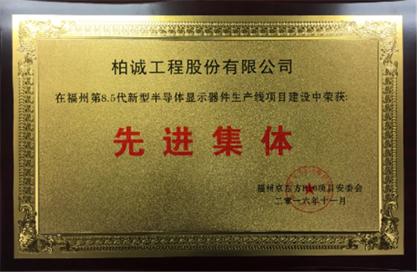 2016年11月,我司在福州京東方第8.5代線新型半導(dǎo)體顯示器件生產(chǎn)線項(xiàng)目中榮獲“先進(jìn)集體”獎(jiǎng)。