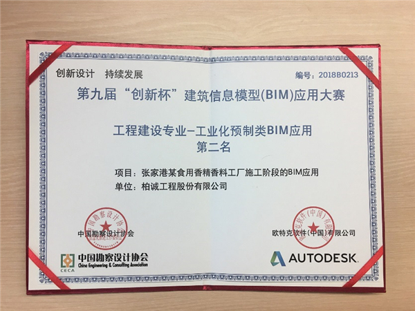 2018年9月,我司張家港某食用香精香料的BIM應(yīng)用項目,在第九屆“創(chuàng)新杯”建筑信息模型(BIM)應(yīng)用大賽中表現(xiàn)優(yōu)秀,喜獲工程建設(shè)專業(yè)—工業(yè)化預(yù)制類BIM應(yīng)用第二名。