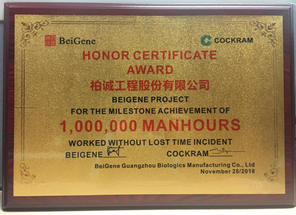 近日,我司在廣州百濟(jì)神州生物制藥有限公司新廠建設(shè)項(xiàng)目中獲業(yè)主頒發(fā)“100萬安全工時(shí)榮譽(yù)證書”。