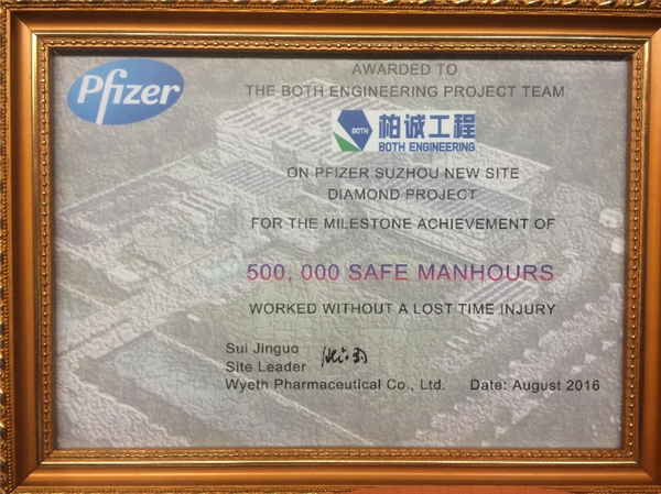 2016年8月,公司蘇州輝瑞項(xiàng)目部在近期現(xiàn)場安全工作中表現(xiàn)突出,業(yè)主特頒發(fā)“50萬工時(shí)安全無事故獎(jiǎng)”以示表彰。