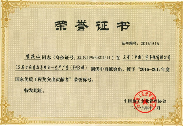 2016年12月,公司參建的三星(中國)半導(dǎo)體有限公司12英寸閃存芯片項(xiàng)目-生產(chǎn)廠房(FAB棟)榮獲“2016-2017年度國家優(yōu)質(zhì)工程獎(jiǎng)”。