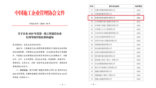 近期,中國施工企業(yè)管理協(xié)會(huì)正式發(fā)布《關(guān)于公布2025年度第一批企業(yè)信用等級評價(jià)結(jié)果的通知》,柏誠系統(tǒng)科技股份有限公司(以下簡稱“BOTH”)作為復(fù)評企業(yè),順利通過評審,再次榮獲“AAA信用等級”證書。這一認(rèn)證體現(xiàn)了公司在合規(guī)經(jīng)營、誠信履約及綜合實(shí)力等方面的持續(xù)領(lǐng)先優(yōu)勢。